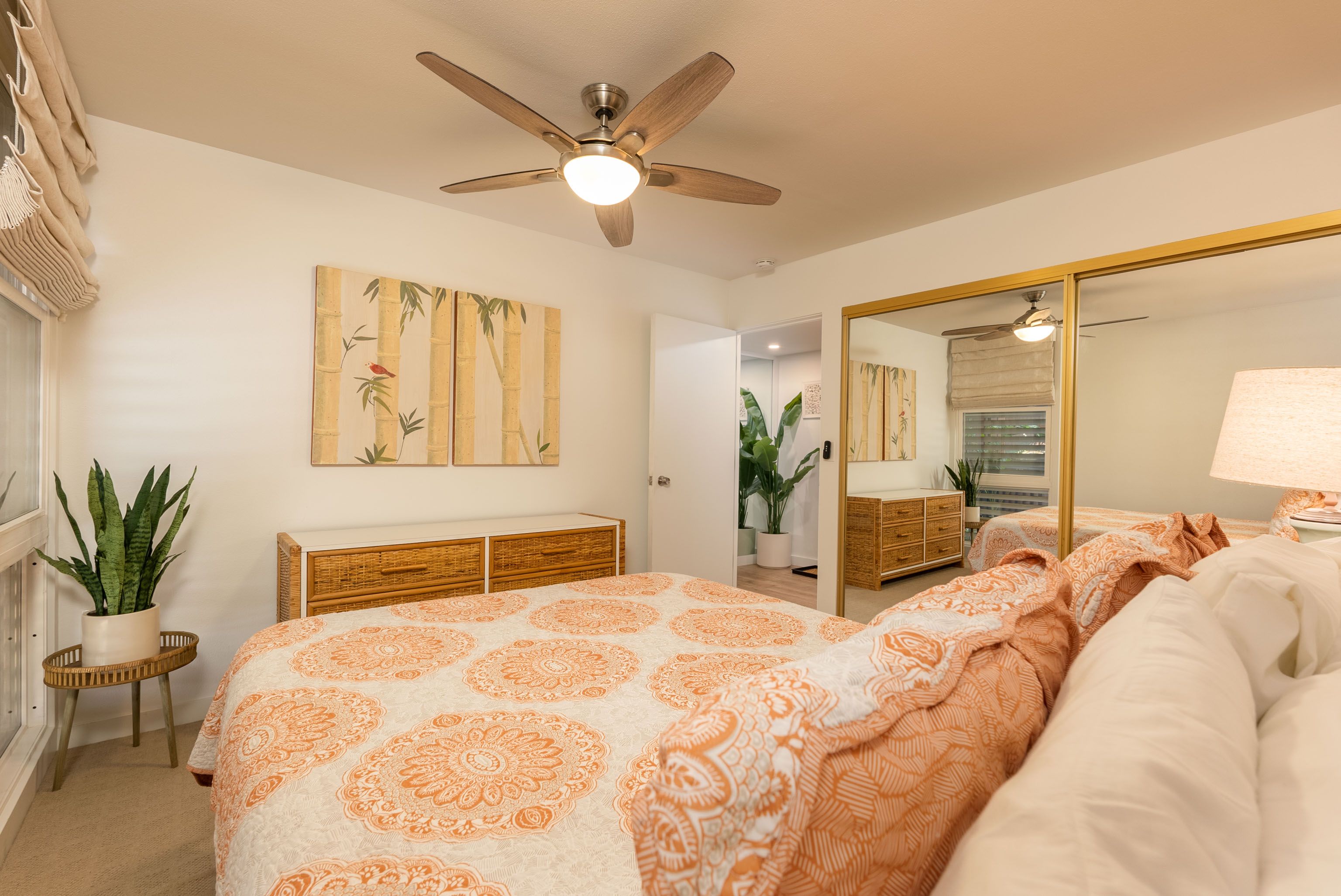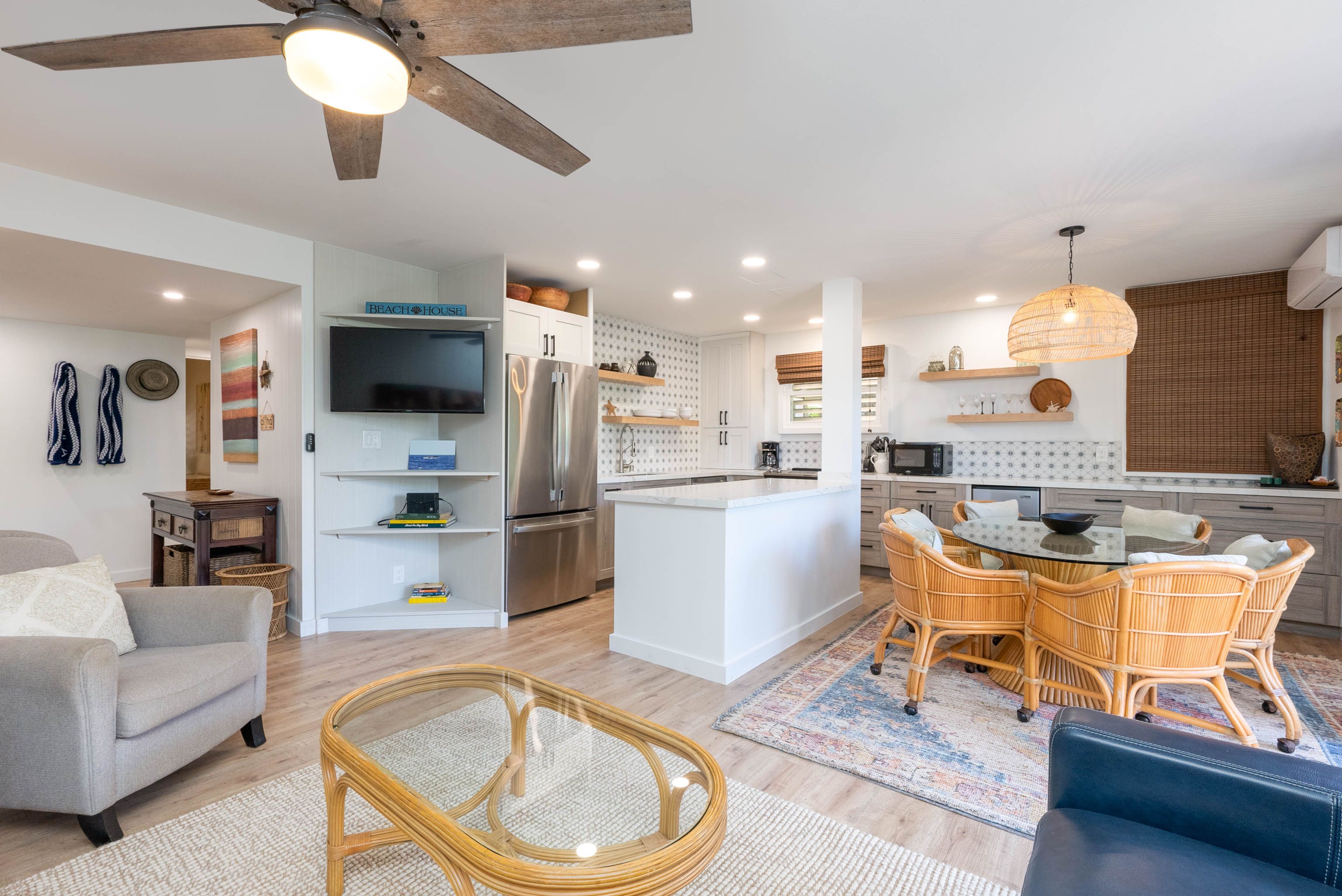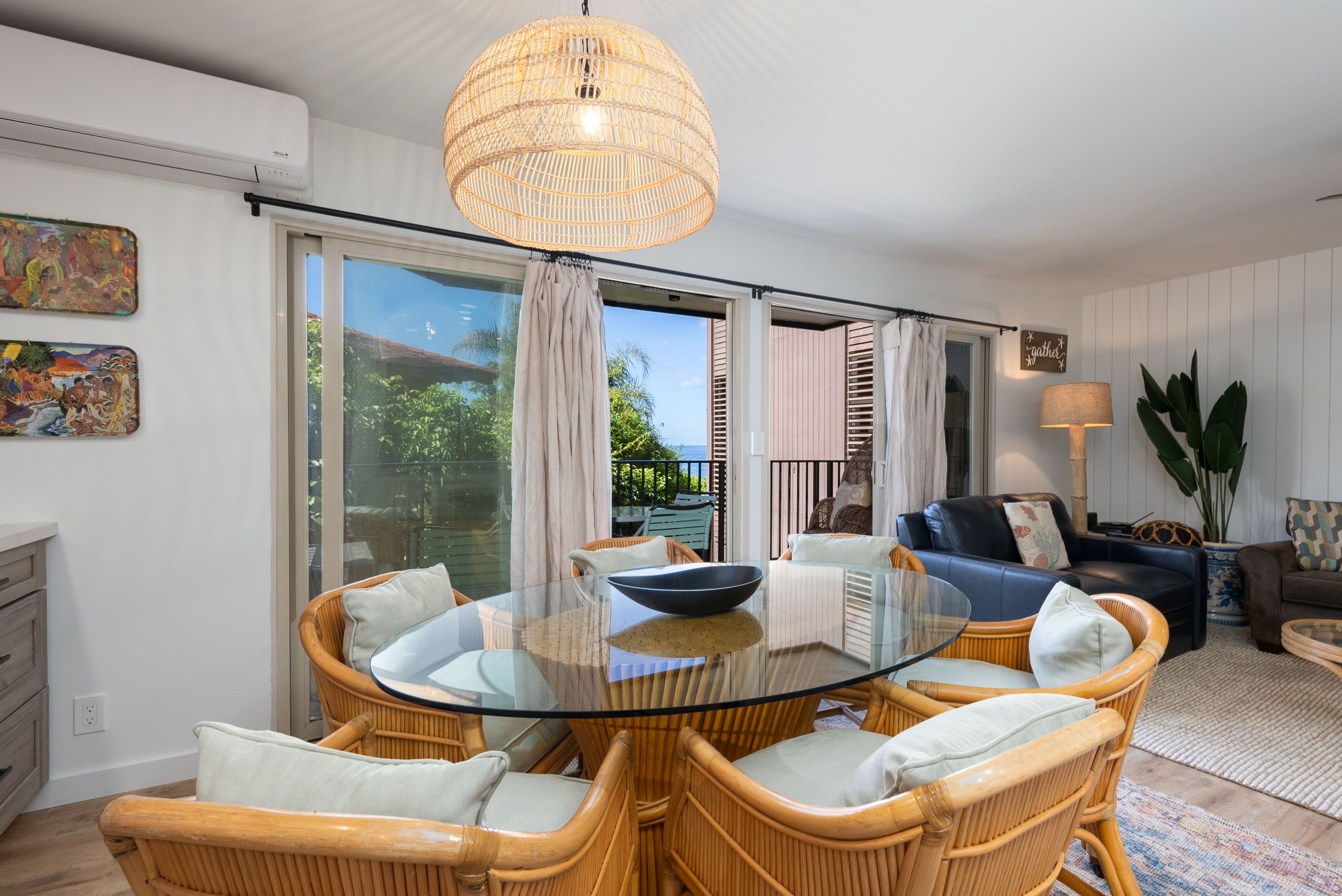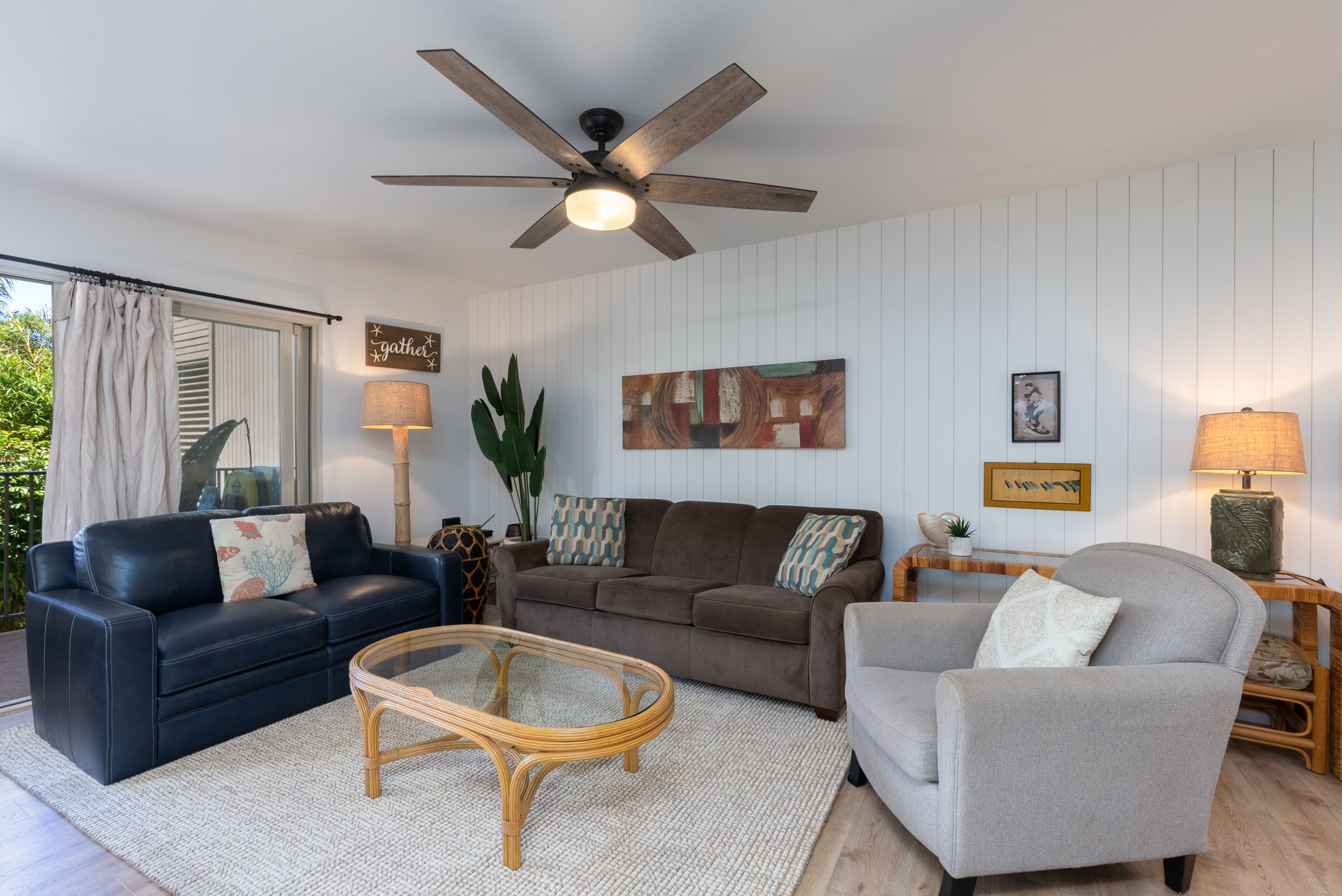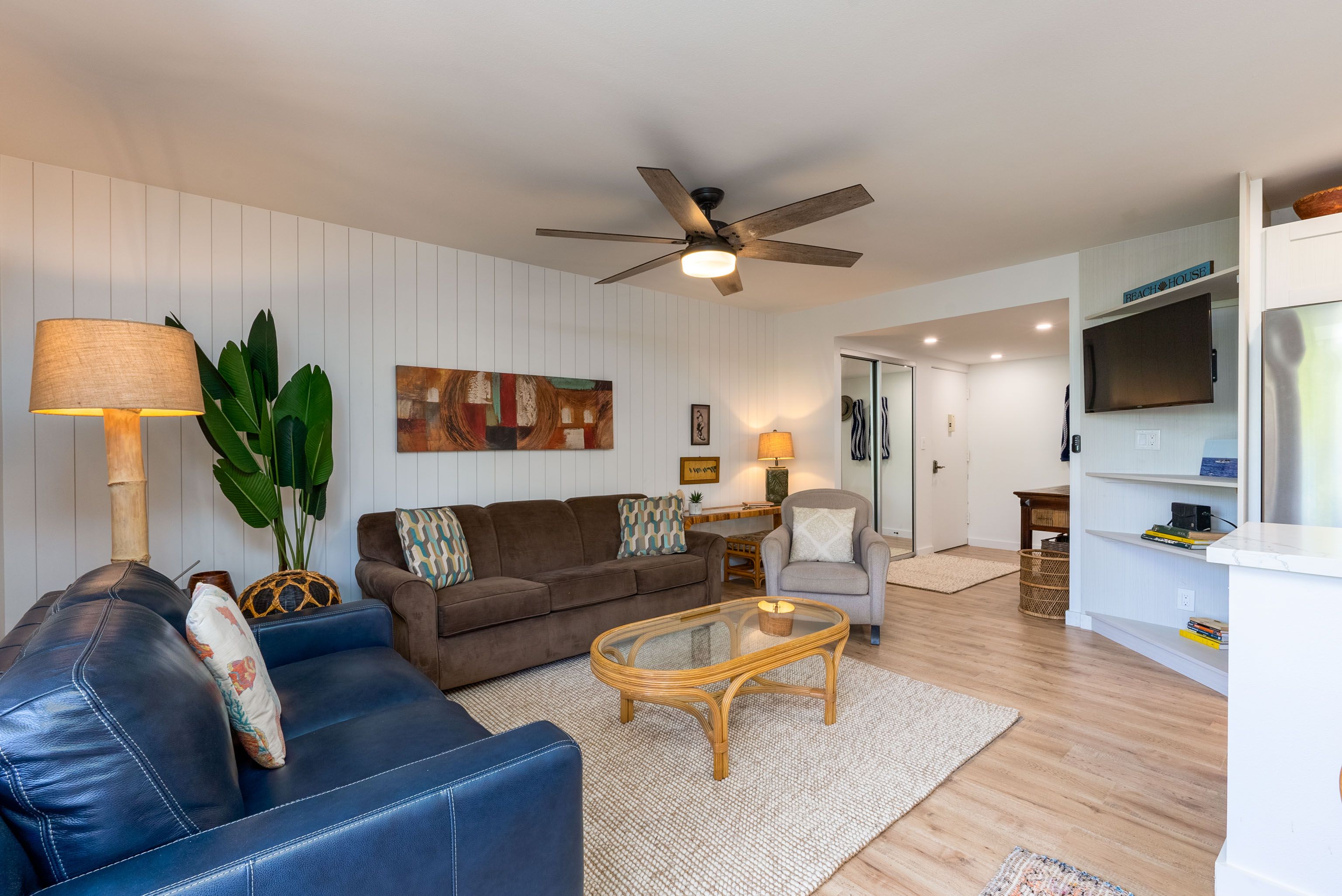 Hale Hui Kai is a beloved location among first time visitors and repeat guests. There is a small shared oceanfront pool next to the common area covered lanai, which is equipped with comfortable lounge space for guests to enjoy when you need a break from the Maui sun. One large high efficiency Air Conditioning unit has been installed in the living room for added comfort. Please note, guest bedrooms have ceiling fans only.