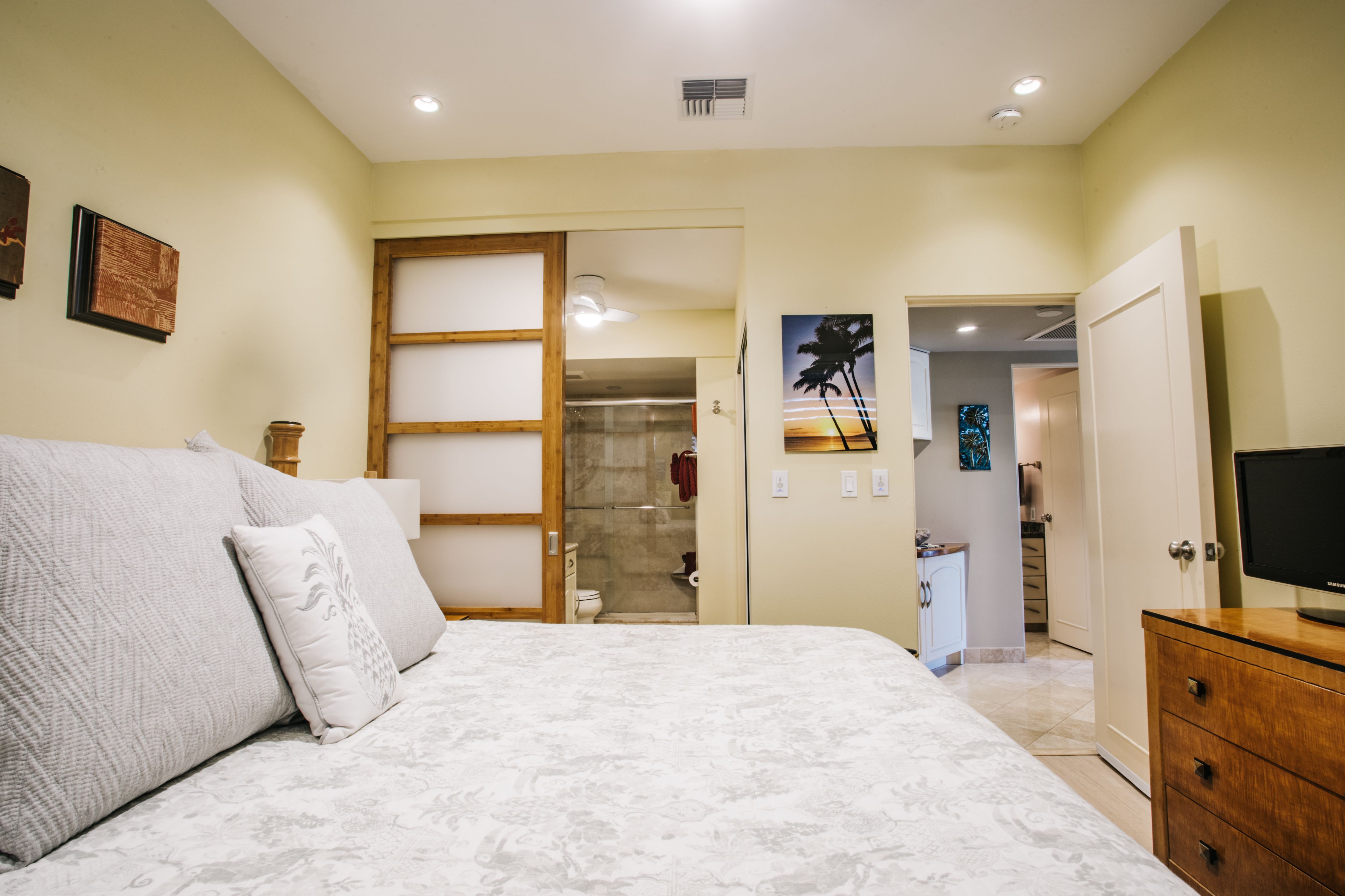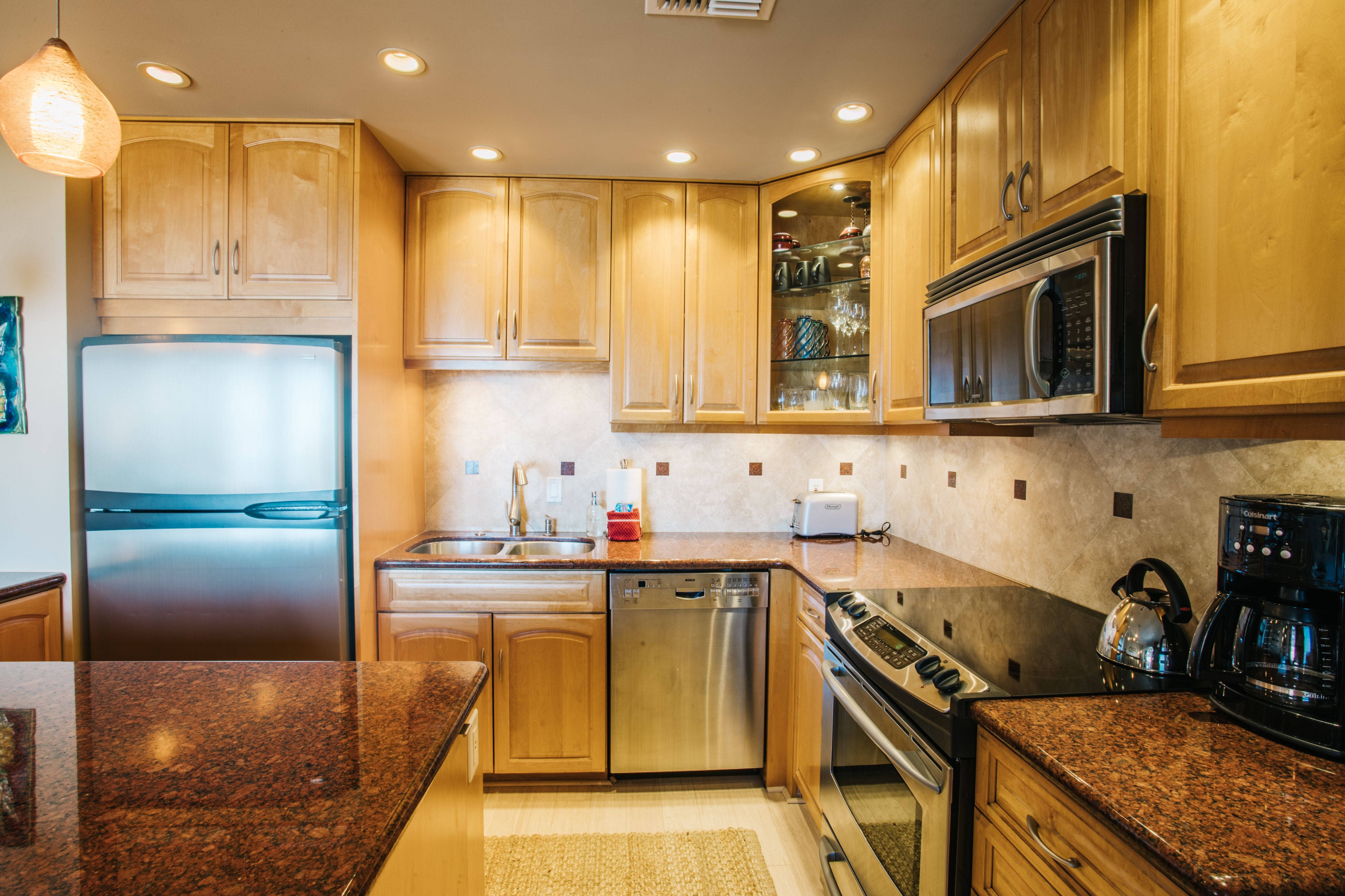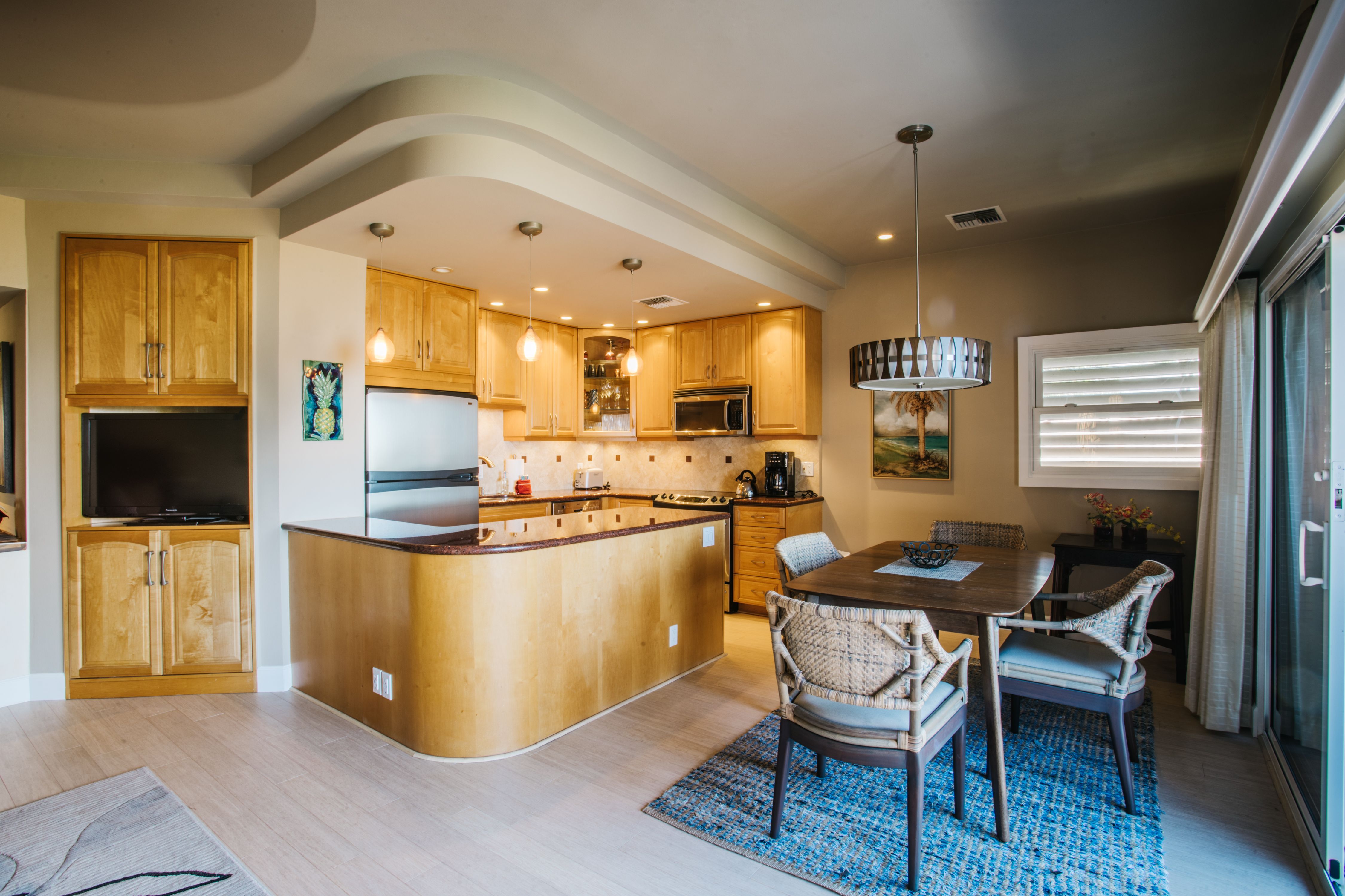 Recently updated and upgraded- this is a wonderful spot for your vacation on Maui. The open floor plan lets the ocean breezes flow through the comfortable designer style living room and gourmet kitchen. The bedrooms both have king beds and split AC units for your sleeping comfort.